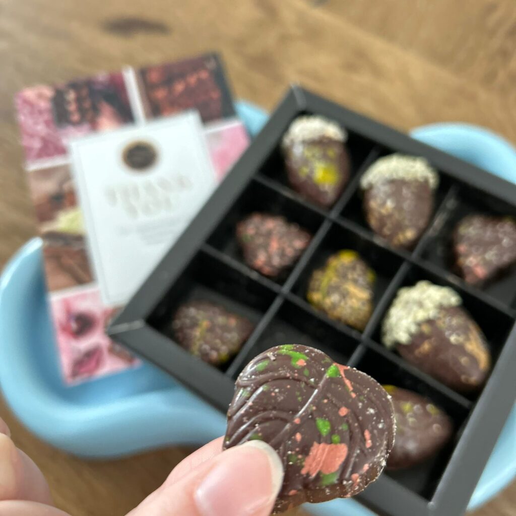 Toen ik het doosje opende, werd ik verrast door chocoladeblaadjes en schattige eikeltjes. Vooral de eikeltjes waren mijn favoriet. Ze zagen er niet alleen geweldig uit, maar hadden ook de lekkerste bite. Wat ik wel miste waren de bolletjes met pistache, die ik online had gezien. Jammer, want ik ben gek op pistache. Maar de smaken die ik kreeg, waren vol en puur.