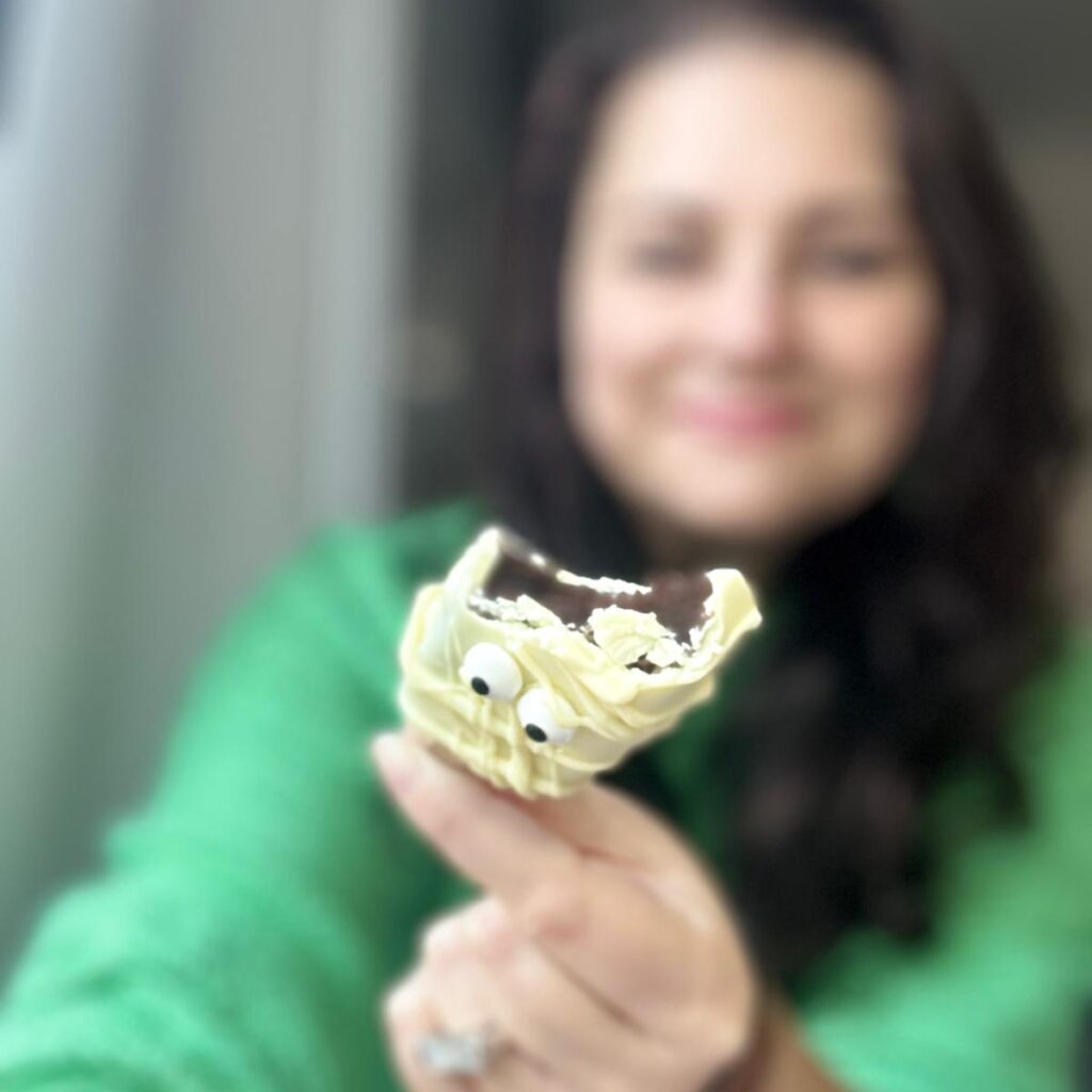 Laat de mummies opstijven in de koelkast tot de chocolade hard is geworden. En klaar zijn ze: glutenvrije mummies op een stokje! - Vind je het fijner om de uitleg in een filmpje te zien, kijk dan even op mijn instagramaccount